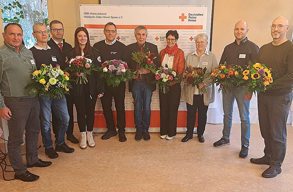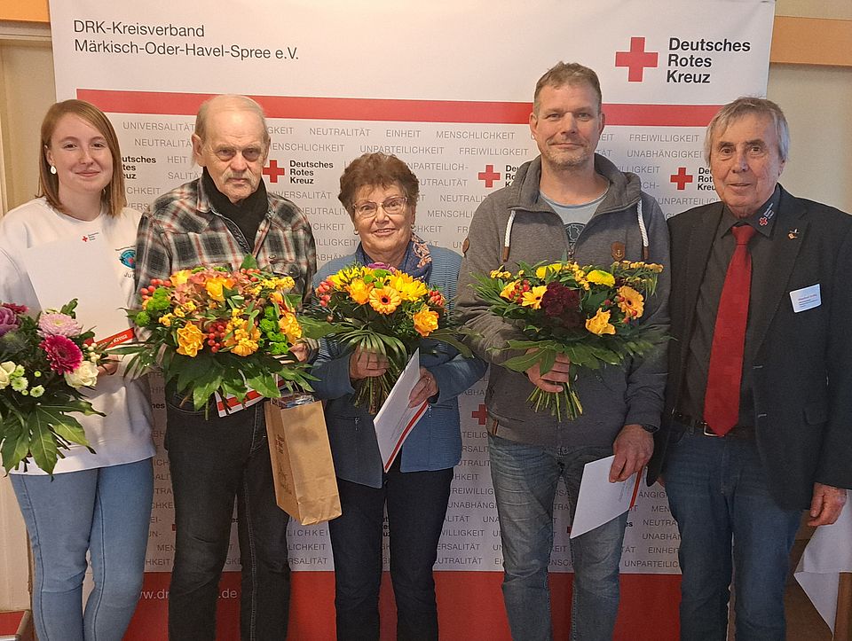 Zum Abschluss der 34. Kreisversammlung nahm Präsident Manfred Helbig mehrere Ehrungen für verdiente ehrenamtlich aktive Mitglieder des DRK-Kreisverbandes vor. Gerd Gutsmuths erhielt aus seinen Händen eine Urkunde für 66 Jahre großartiges ehrenamtliches Engagement im Bereich der realistischen Unfalldarstellung, die dem Jugendrotkreuz angegliedert ist. Für 25-jährige ehrenamtliche Tätigkeit gab es Auszeichnungsspangen für Brigitte Feind (Wohlfahrts- und Sozialarbeit, Senioren-Ortsgruppe Beeskow) und Ralf Pröseler (Bereitschaft Fürstenwalde). Das Verdienstabzeichen in Bronze des DRK-Landesverbandes Brandenburg e.V. als Dank und Anerkennung für ehrenamtliche Einsatzbereitschaft und Leistungen erhielt Jaqueline Köhler-Terz vom Jugendrotkreuz Oranienburg.