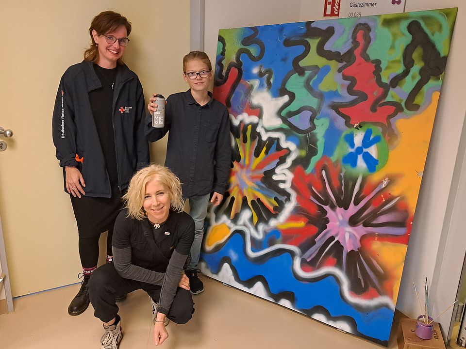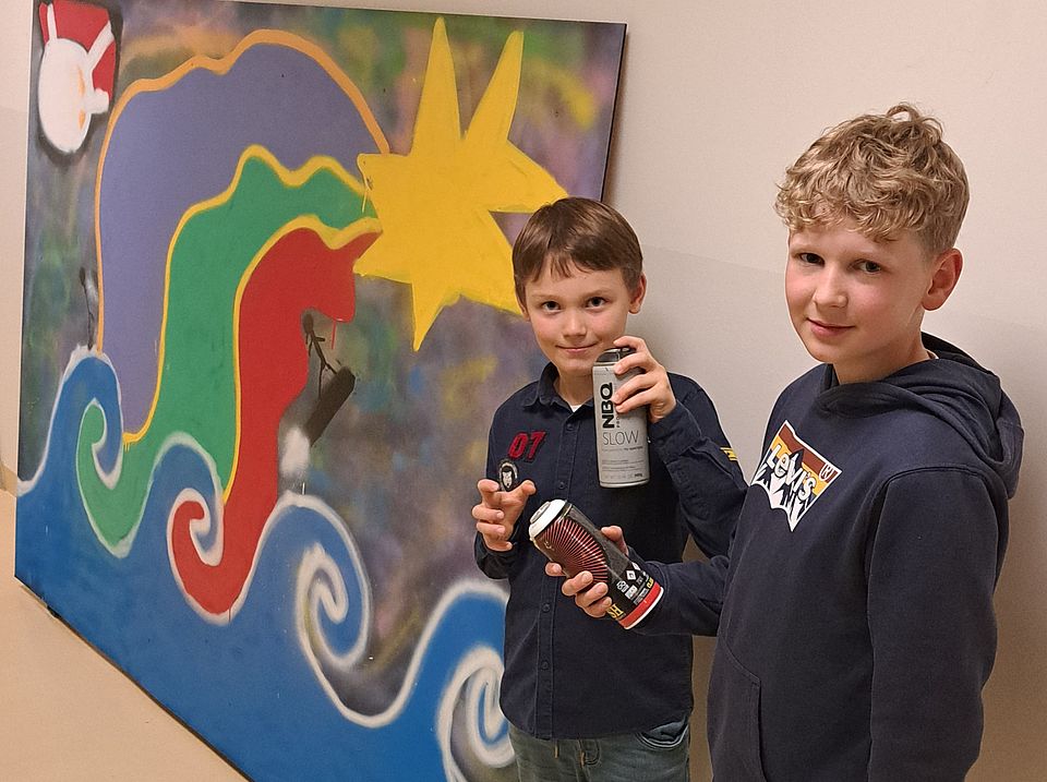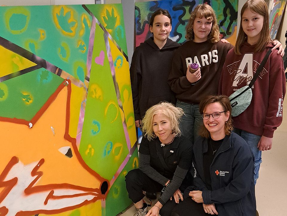 Die Sechstklässlerinnen Meta, Lene und Phoebe wählten zum Beispiel einen Fuchs als Motiv des Bildes, das sie mit Farben aus Spraydosen schufen. Das Tier sehen sie als Symbol für Natur und Bewegung, für Wildheit und Freiheit. Andere wie Thies und Cord entschieden sich für abstraktere Motive. Begleitet wurden die Grundschüler*innen von Kirstin Günther, die sich gemeinsam mit Diana Heisig für den DRK-Kreisverband um die Sozialarbeit an der Friedrich-Wolf-Grundschule im Oranienburger Ortsteil Lehnitz kümmert.
