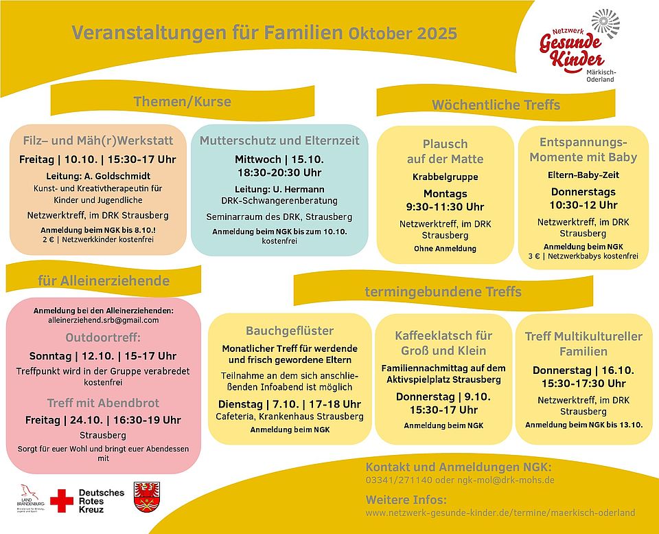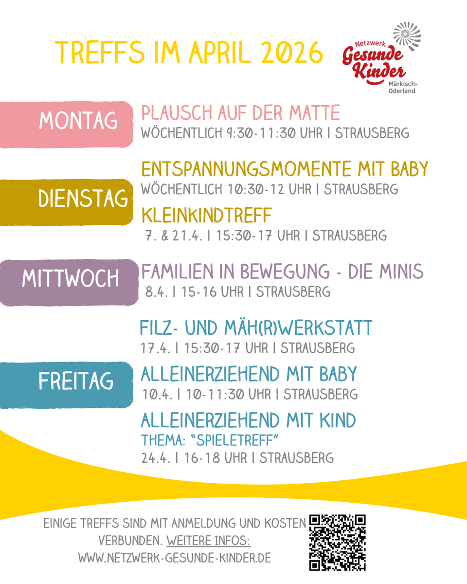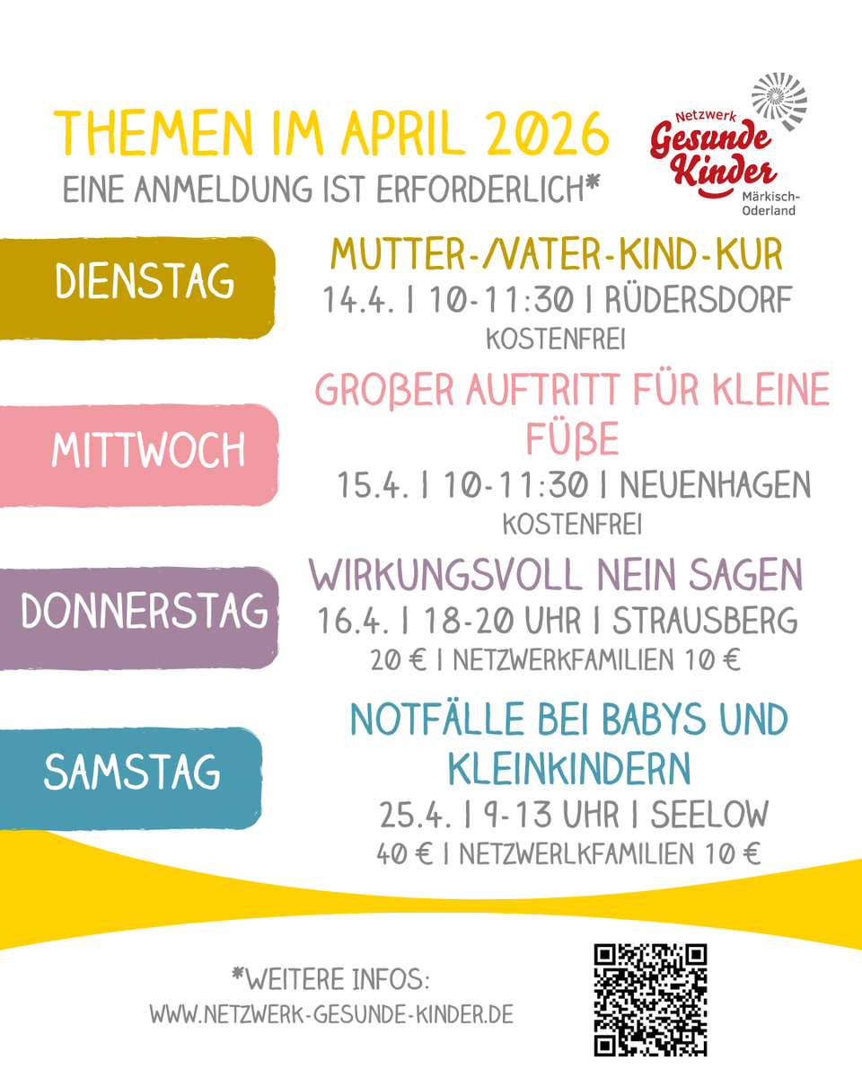 Die Angebote des Regionalnetzwerkes Gesunde Kinder Märkisch-Oderland richten sich an alle schwangeren Frauen sowie an Mütter und Väter mit Kindern von 0 bis 3 Jahren mit Wohnsitz im Landkreis Märkisch-Oderland. All unsere Angebote stehen Familien offen, die sich im Netzwerk Gesunde Kinder anmelden möchten und sind für diese kostenfrei. Um sich über eine Teilnahme zu informieren, rufen Sie uns einfach an.